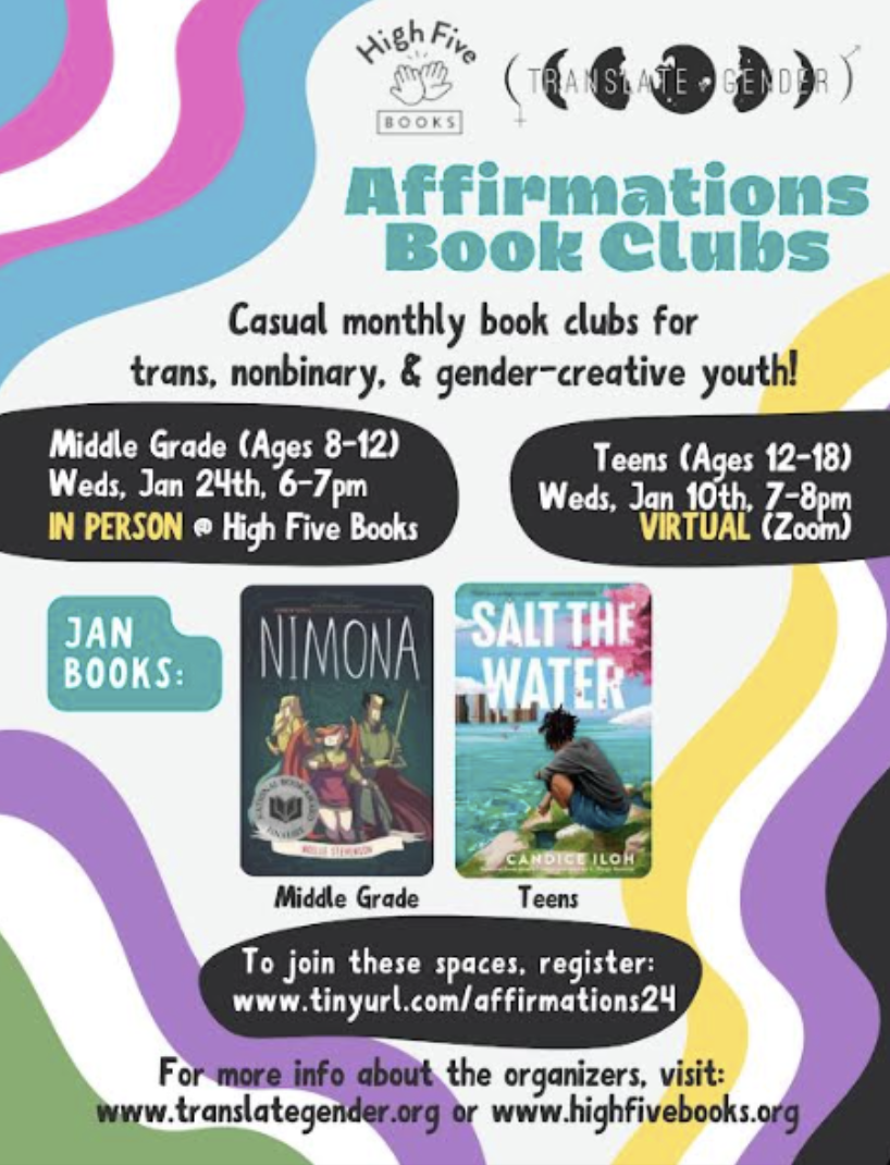 Affirmations: Trans Book Club is a book club like no other! Geared towards trans and nonbinary youth (ages 8-18), Affirmations invites readers to explore, question, and connect with one another and the centered experiences of trans, nonbinary, and gender-creative book characters.