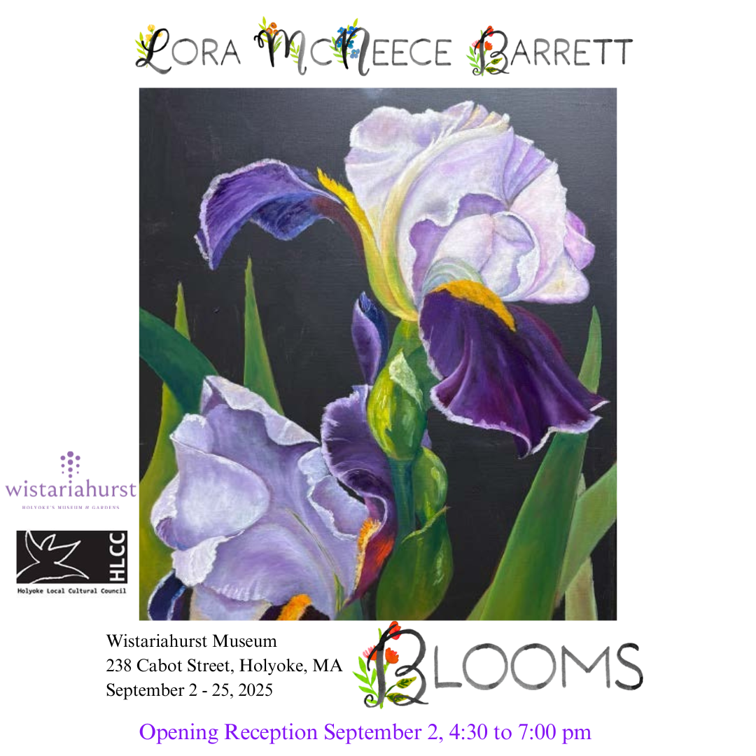 Durante el mes de septiembre, el gran salón del Museo Wistariahurst se llenará de flores para dar la bienvenida a «Blooms», una exposición de arte de la pintora Lora Barrett. Esta exposición contará con 99 vibrantes pinturas de flores de diferentes tamaños. Lora Barrett, una apasionada de la jardinería, mantiene sus jardines como referencia y musa para sus pinturas de vivos colores, llevando la vitalidad de las flores al límite. El Museo Wistariahurst acogerá una exposición individual de 99 de sus pinturas florales del 2 al 25 de septiembre de 2025.