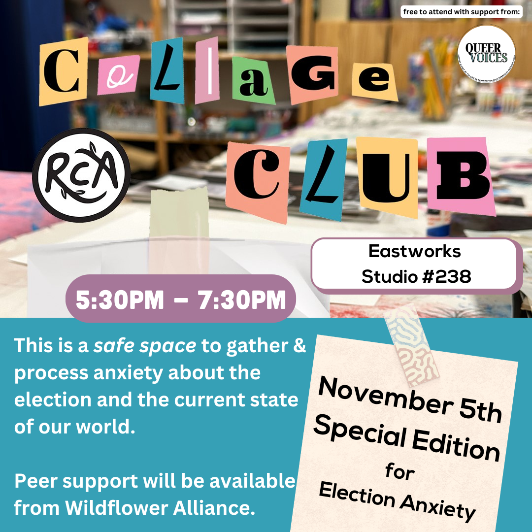 Back to All Events Collage Club Tuesday, November 5, 2024 5:30 PM 7:30 PM RCA Studio, Suite #238, Eastworks 116 Pleasant Street Easthampton, MA, 01027 United States (map) Google Calendar ICS RCA is known for their endless supply of Nat Geo magazines, wacky prints and collected odds and ends. They figured it was time they give our collage fanatics a special program just for you!Click/tap the button below for more information. More Info