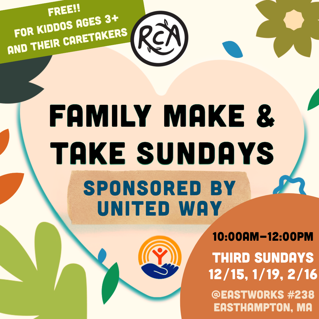 Back to All Events Family Make & Take Sundays Sunday, February 16, 2025 10:00 AM 12:00 PM RCA Studio, Suite #238, Eastworks 116 Pleasant Street Easthampton, MA, 01027 United States (map) Google Calendar ICS This one's for the tiny creators with big ideas!! Join RCA each month for a featured activity ranging from painting, 3D sculpture, printmaking, drawing, and more!Click/tap the button below for more information. More Info