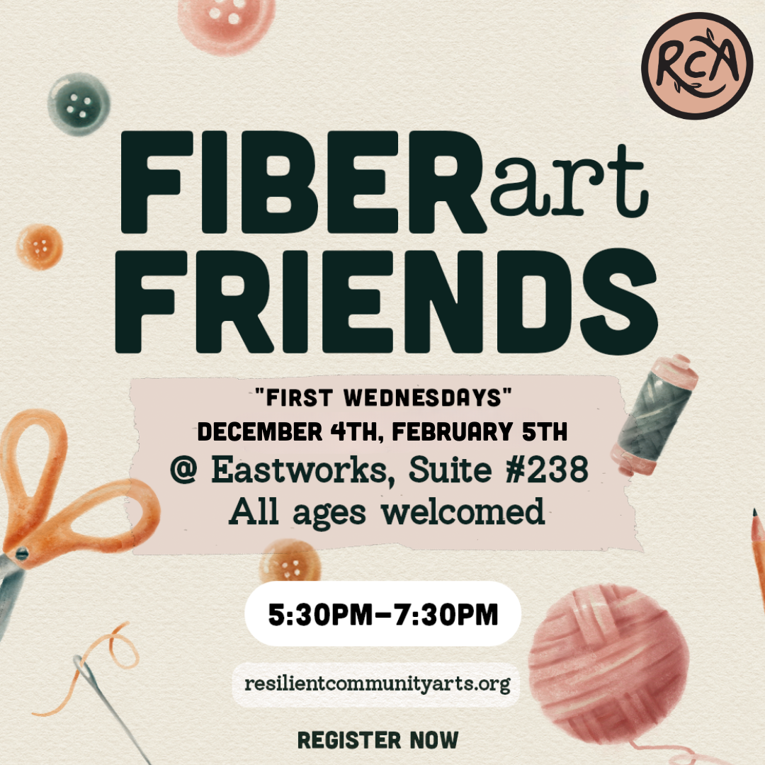 Fiber Art Friends Wednesday, December 4, 2024 5:30 PM 7:30 PM RCA Studio, Suite #238, Eastworks 116 Pleasant Street Easthampton, MA, 01027 United States (map) Google Calendar ICS Fiber Art Friends is an intergenerational space for fiber artists and fiber-curious folks to create in community, learn from one another, and try new things.Click/tap the button below for more information. More Info