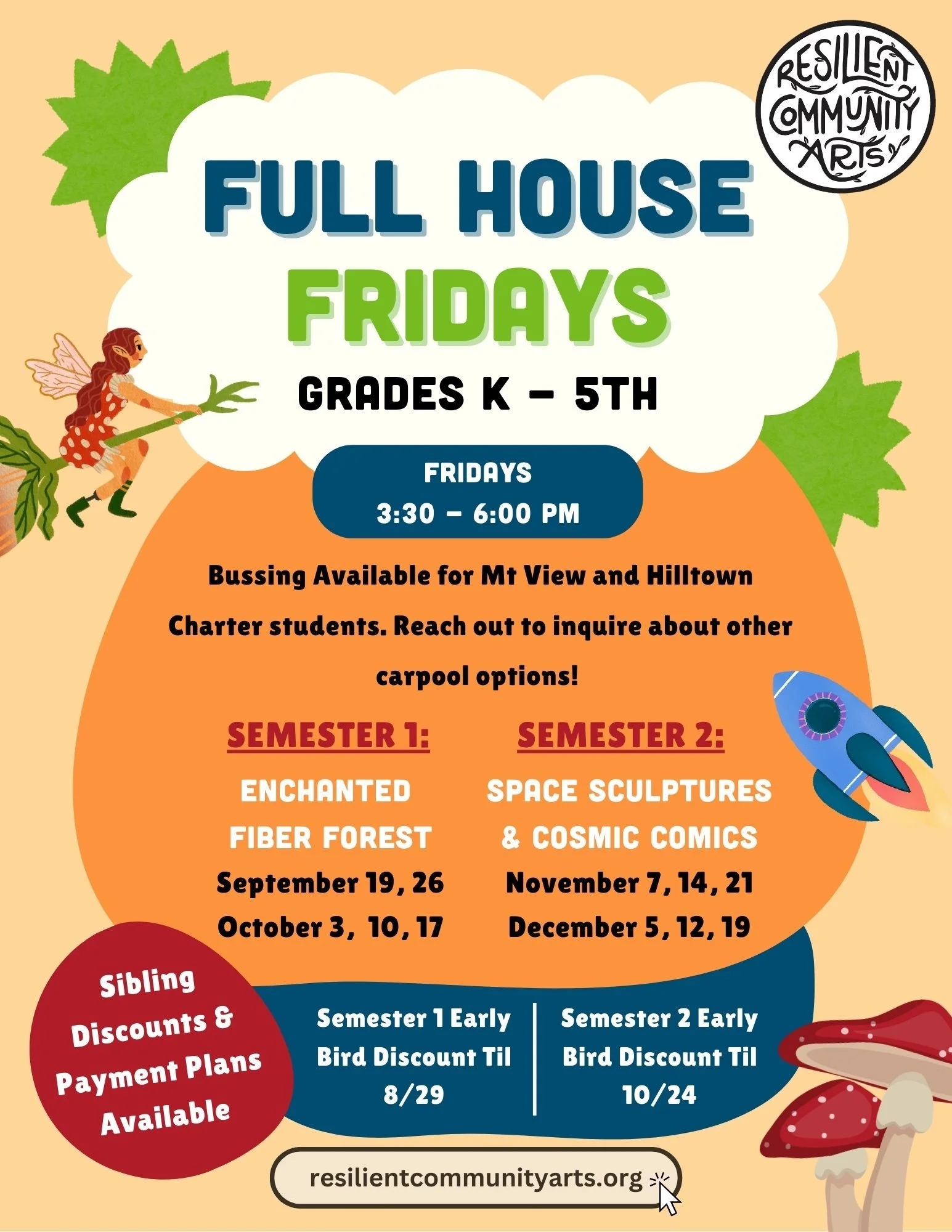 Full House Fridays: Enchanted Fiber Forest Friday, October 3, 2025 3:30 PM 6:00 PM RCA Studio, Suite #238, Eastworks 116 Pleasant Street Easthampton, MA, 01027 United States (map) Google Calendar ICS Full House Fridays is an opportunity for both K-2nd students and for 3rd-5th graders; a perfect option for families with siblings in different age groups!Click/tap the button below for more information and to register. Host Website