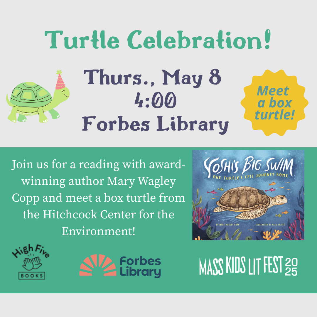 Join High Five Books at the Forbes Library for a Turtle Celebration! As part of Mass Kids Lit Fest 2025, award-winning author Mary Wagley Copp will read from her picture book YOSHI'S BIG SWIM and the Hitchcock Center for the Environment will bring a box turtle for you to meet!