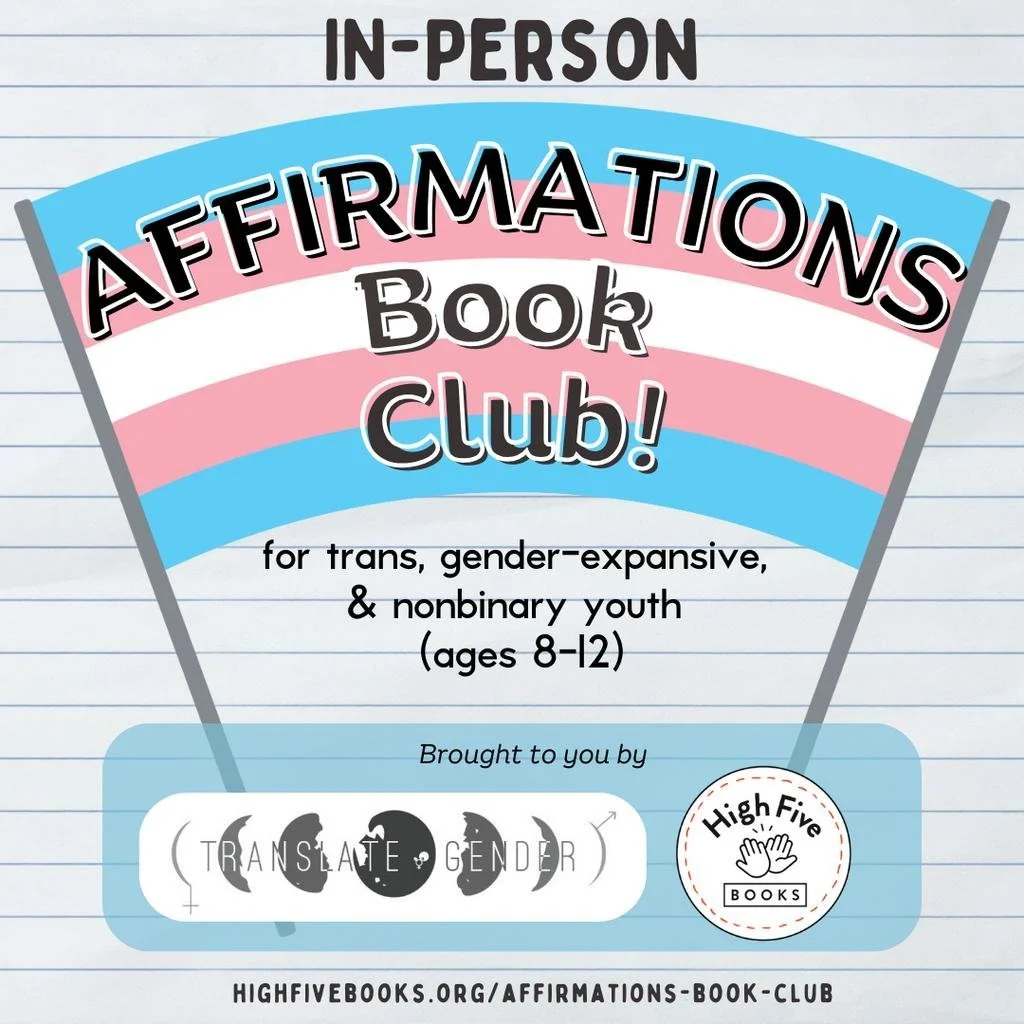 Trans, non-binary, and gender-creative youth (ages 8-12) are invited to join High Five Books and Translate Gender in-person at High Five Books each month for a casual, super-fun book club.