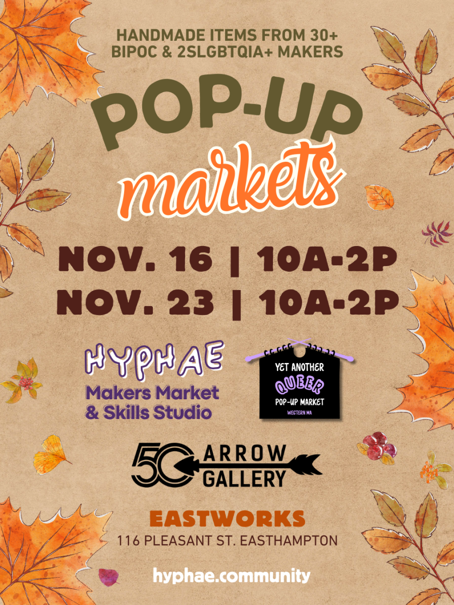 Join us in the 50 Arrow Gallery and across the Eastworks foyer, to dream with us in the future HYPHAE space with a makers market. Browse 20+ vendors with a variety of high-quality, handmade wares across mediums of print, ceramics, textiles, jewelry, and more. Learn more about HYPHAE and shop to help open the doors to this amazing dream while also supporting local makers! Then buy some local veggies and fruits at the Easthampton Farmers Market! Masks required per radical community care.