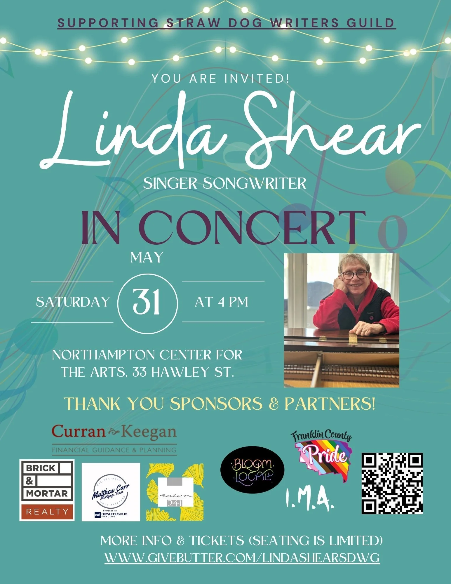 Straw Dog Writers Guild invites you to this benefit concert by singer-songwriter Linda Shear at 4 pm on Saturday, May 31, 2025, at the Northampton Center for the Arts.