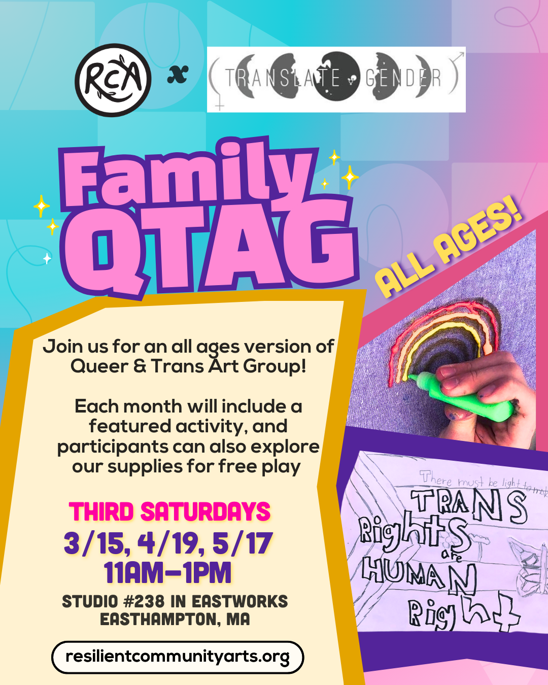 Join Translate Gender and Resilient Community Arts for an all-ages version of Queer and Trans Art Group! Open to anyone who identifies as queer, trans, or gender-expansive, come hang out, make art in community, or just connect with other queer and trans folks in a safer space.