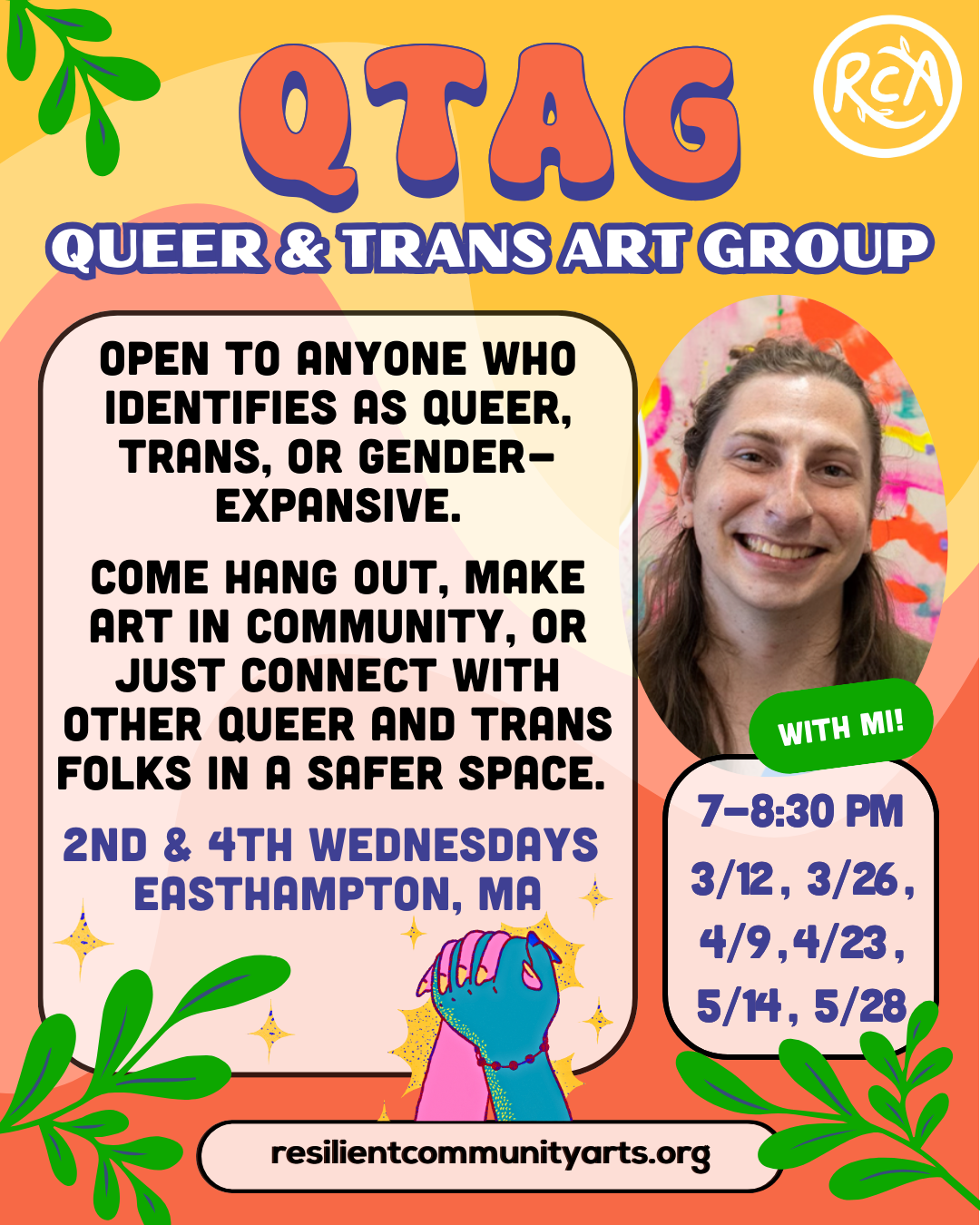 Queer & Trans Art Group (QTAG) Wednesday, May 14, 2025 7:00 PM 8:30 PM RCA Studio, Suite #238, Eastworks 116 Pleasant Street Easthampton, MA, 01027 United States (map) Google Calendar ICS Open to anyone who identifies as queer, trans, or gender-expansive, come hang out, make art in community, or just connect with other queer and trans folks in a safer space!Click/tap the button below for more information and to sign up. Host Website
