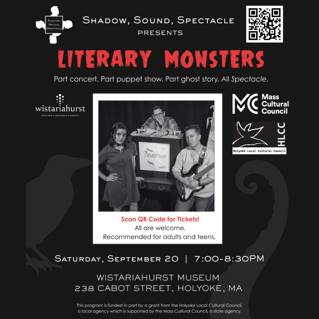 Part concert, part puppet show, part ghost story. This 50-minute multimedia performance reimagines classic literary monsters through queer, musical shadow theater and features a world premiere video. Join ensemble Shadow, Sound, Spectacle for a fresh perspective on the works of Edgar Allen Poe, Mary Shelley, Emily Dickinson, Anne Rice, and others, told through live music, shadow puppetry, video, and narrative. All are welcome, but recommended for adults and teens. Q&A to follow. This program is funded in part by a grant from the Holyoke Local Cultural Council, a local agency which is supported by the Mass Cultural Council, a state agency.