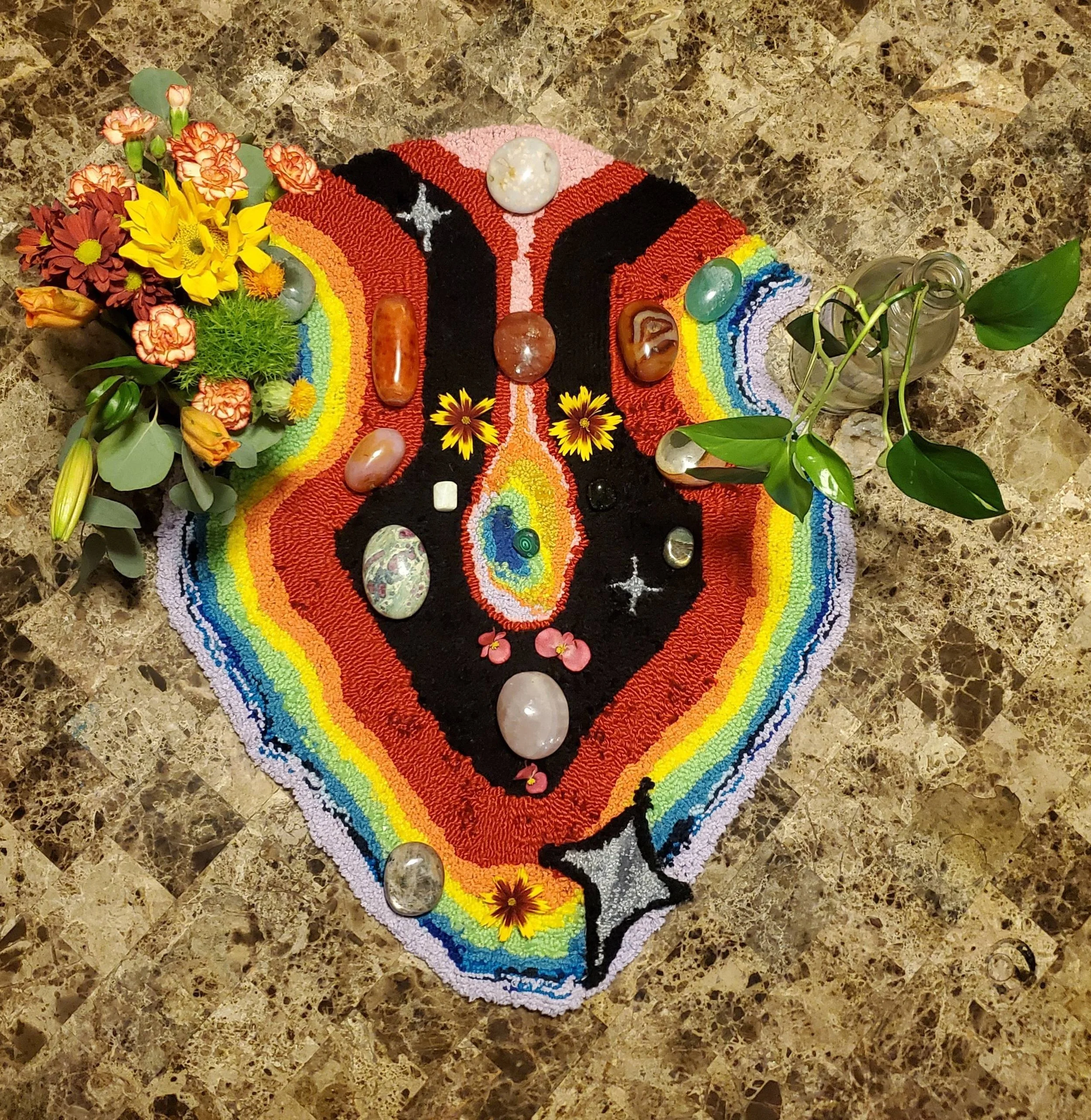 Explore tufted art and handmade books by a self-described "art witch crafting visual spells that are portals to higher vibrations." Made with a tufting gun that shoots yarn through the back of a canvas to form a type of rug, tufted art can be displayed on a wall, table, or altar. These pieces add simplicity, softness, and enchantment to any space. Brenda believes that "crafting is a wellness practice" and she teaches book art workshops to share the magic of accessing a flow state through crafting.
