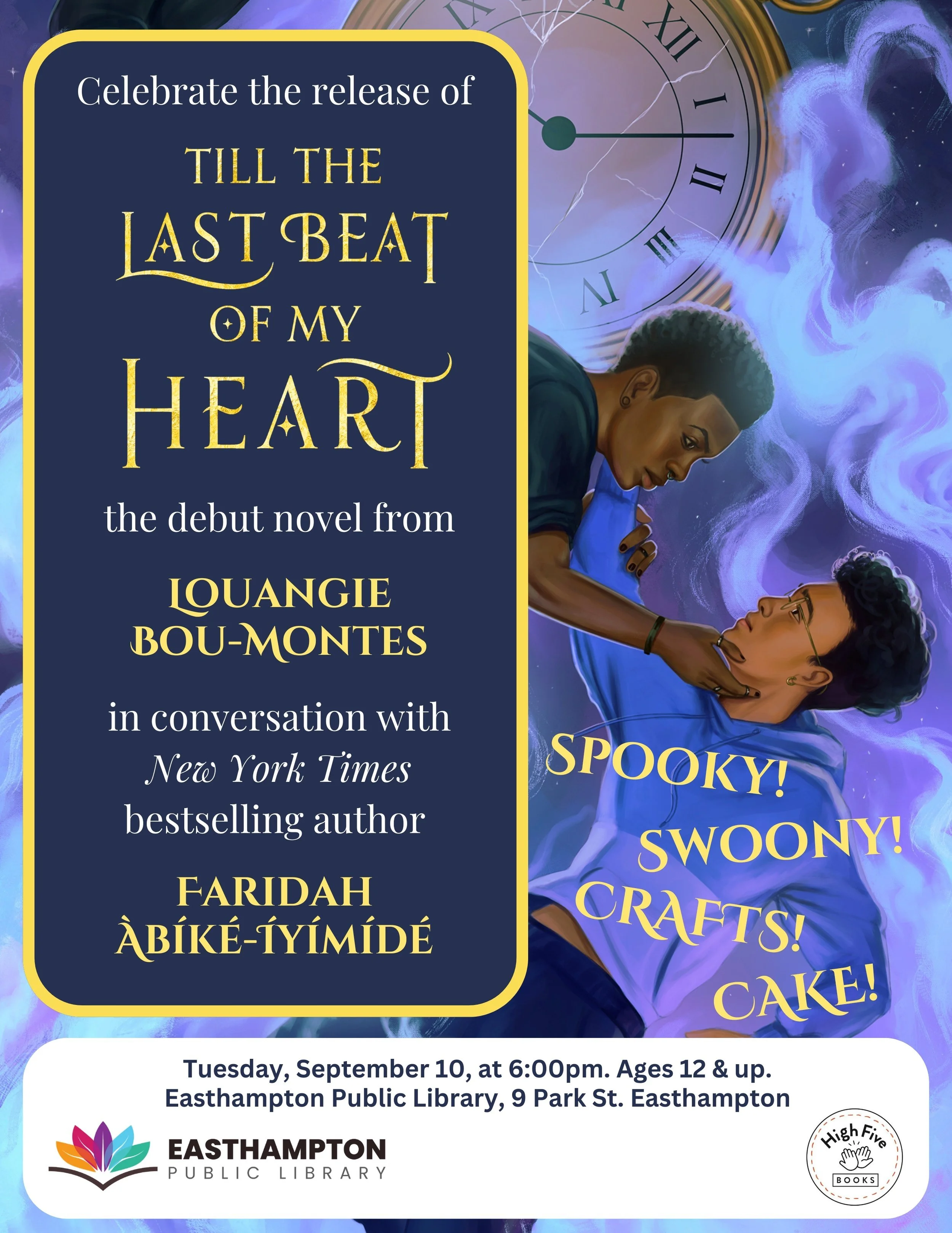 Come join High Five Books at the Easthampton Public Library for the unforgettable debut novel release of local author, Louangie Bou-Montes! Louangie will be talking about her spooky, swoony, queer YA contemporary fantasy novel, TILL THE LAST BEAT OF MY HEART—and she'll be in conversation with Faridah Àbíké-Íyímídé, New York Times bestselling author of ACE OF SPADES and WHERE SLEEPING GIRLS LIE (two High Five favorites!).