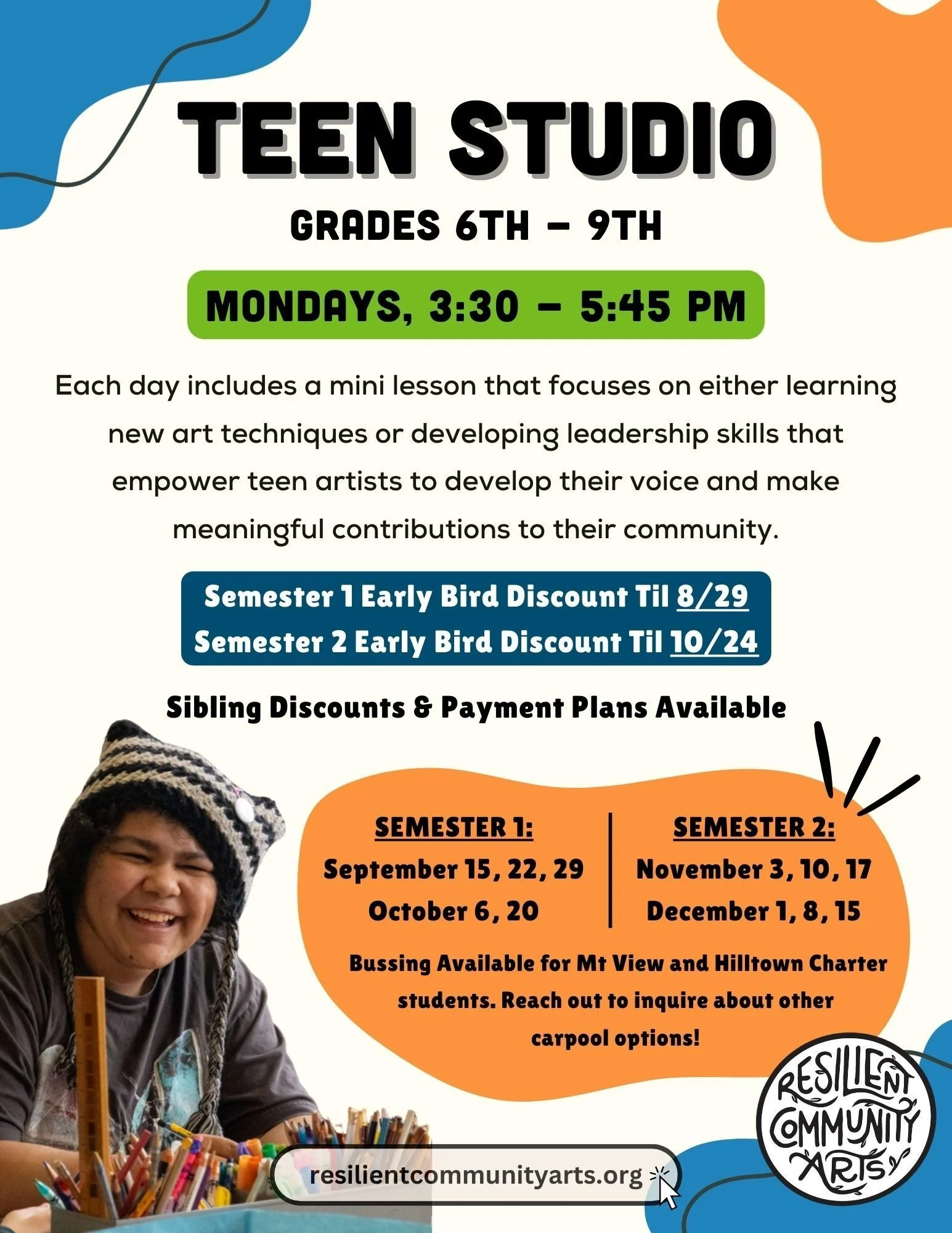 A supportive, flexible environment for teen artists, letting them shape their own creative journeys through a wide range of mediums— printmaking, sculpture, jewelry making, painting, and more!