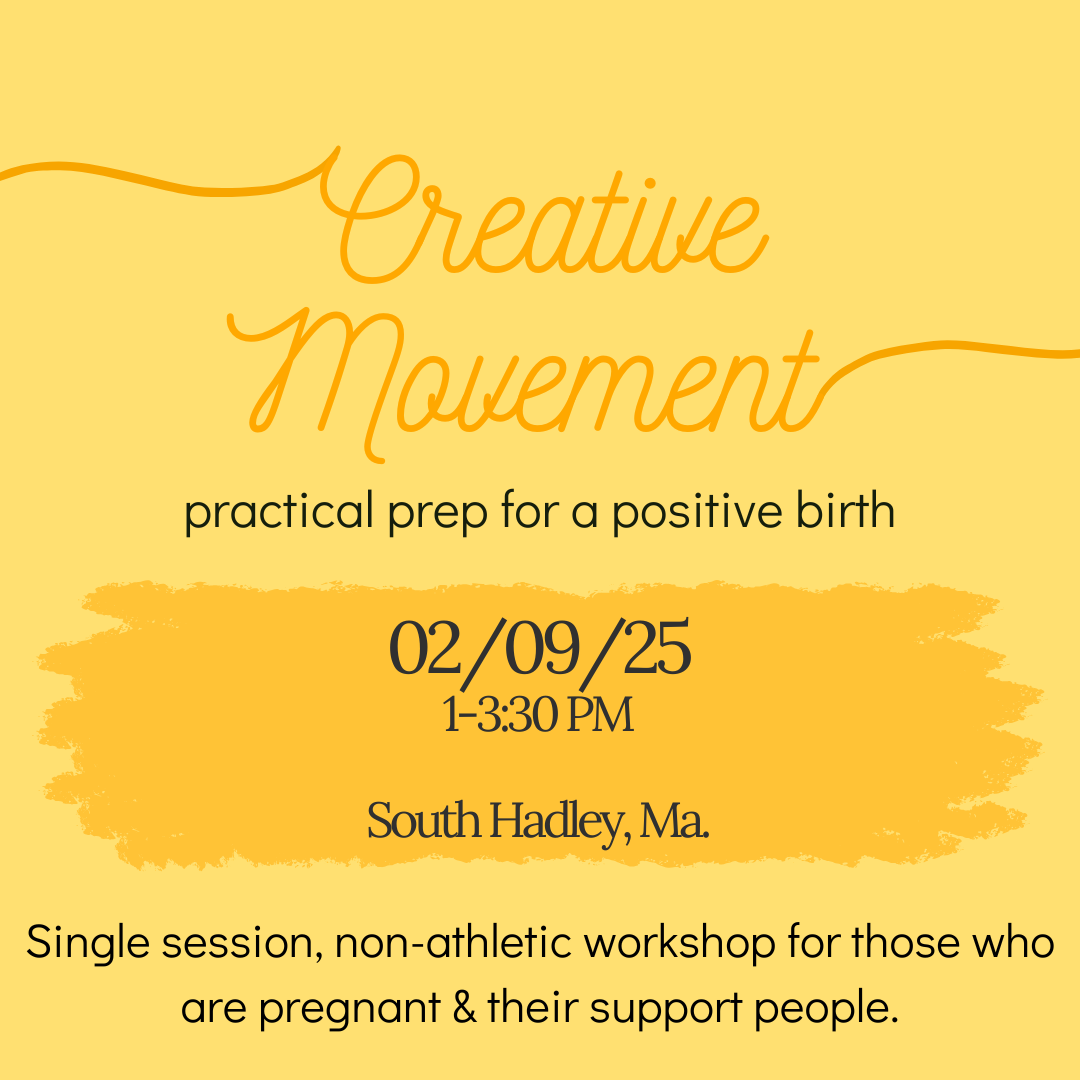 Appropriate for any stage of pregnancy. Come solo or with a support person to learn how you and baby can use movement to your advantage during your birth! February 9, 2025 1 PM - 3:30 PM in South Hadley, MA.