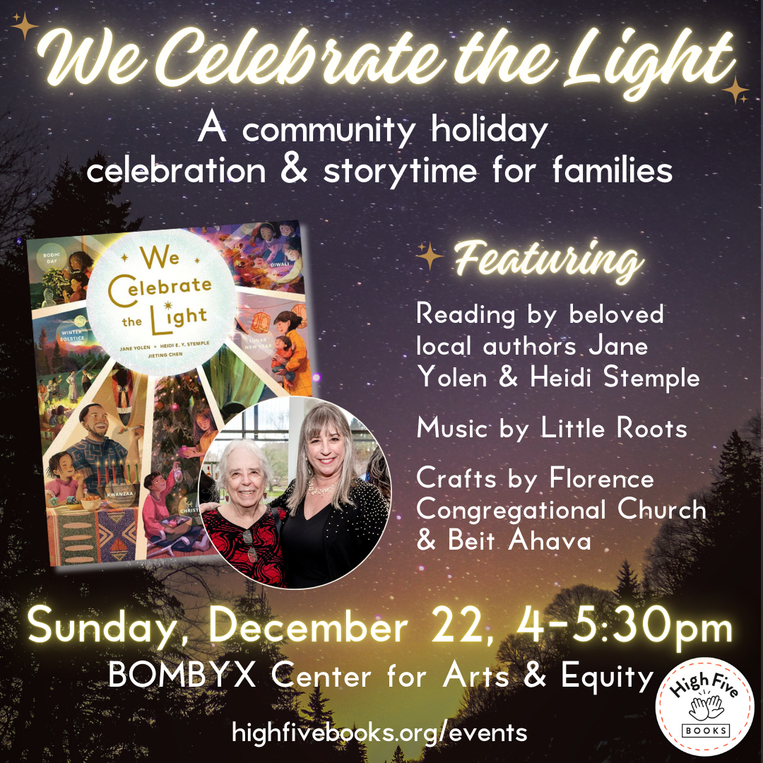 Join beloved local authors Jane Yolen and Heidi E.Y. Stemple for this community interfaith holiday celebration. Families are invited to make light-inspired crafts provided by BOMBYX in-house congregations, Beit Ahavah, The Reform Synagogue of Greater Northampton, and Florence Congregational Church.