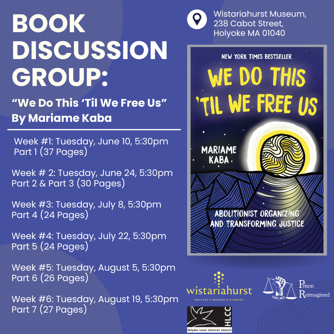 Join fellow readers for the next book discussion group at Wistariahurst beginning June 10th, 2025. Readers will dive into “We Do This 'Til We Free Us- Abolitionist Organizing and Transforming Justice” by Mariame Kaba. This powerful collection of essays and interviews, woven together by Kaba covers topics including abolition, liberation, and political struggle.