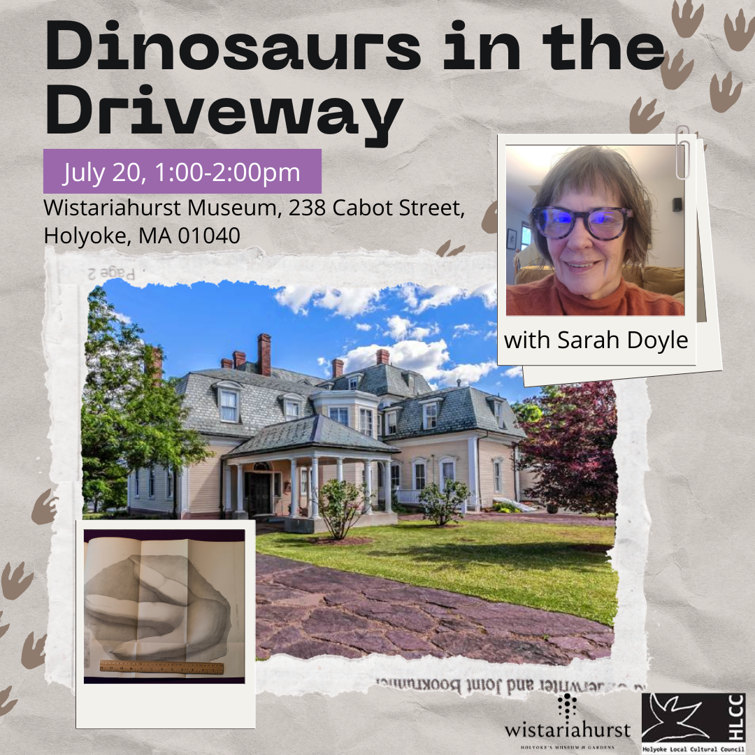 Visit Wistariahurst Museum to experience Dinosaurs in the Driveway with Sarah Doyle. Doyle dives into the history of the dinosaur tracks leading up to Wistariahurst. In 1927, when Belle Skinner had slabs of sandstone with dinosaur footprints laid as a driveway to Wistariahurst, it may have seemed an idiosyncratic choice. Although the tracks were well known locally, dinosaurs had not yet made the big mark on pop culture we see today. It is only in recent years that scientific interest in the footprints has been revived, yet their discovery in the valley in 1835 made our local small towns and people well known to scientists in Britain and Europe. How the Connecticut River Valley became part of international dialogue over identifying what had made the footprints -- if they even were footprints! -- makes a fascinating trip into another little slice of local history.