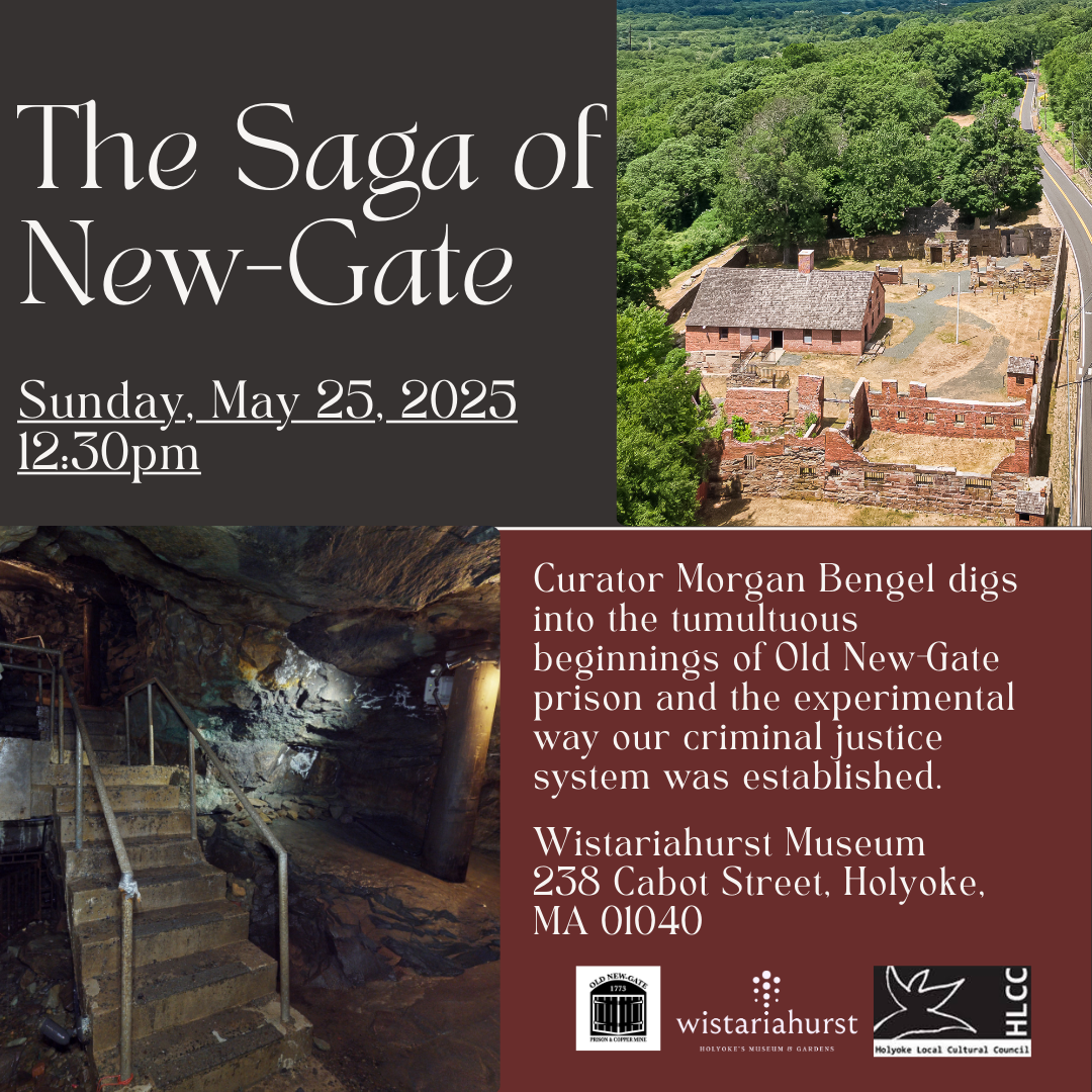 East Granby Connecticut’s Old New-Gate Prison will be presenting while Prison Reimagined is on view. The Saga of New-Gate, hosted by Old New-Gate Prison’s Curator, Morgan Bengel will dig into the tumultuous beginnings of the prison and the experimental way our criminal justice system was established. Old New-Gate Prison & Copper Mine is recognized as our Nation’s first chartered Copper Mine (1707) and First State Prison (1773). “Those distinctions did not come without trials and tribulations..” says Bengel. “Countless prison escapes lend themselves to a dramatic story, with meaningful impact for our State and National history.” The Saga of New-Gate will be held Sunday, May 25th at 12:30pm at Wistariahurst. This event is sponsored by Old New-Gate Prison and the Holyoke Local Cultural Council.