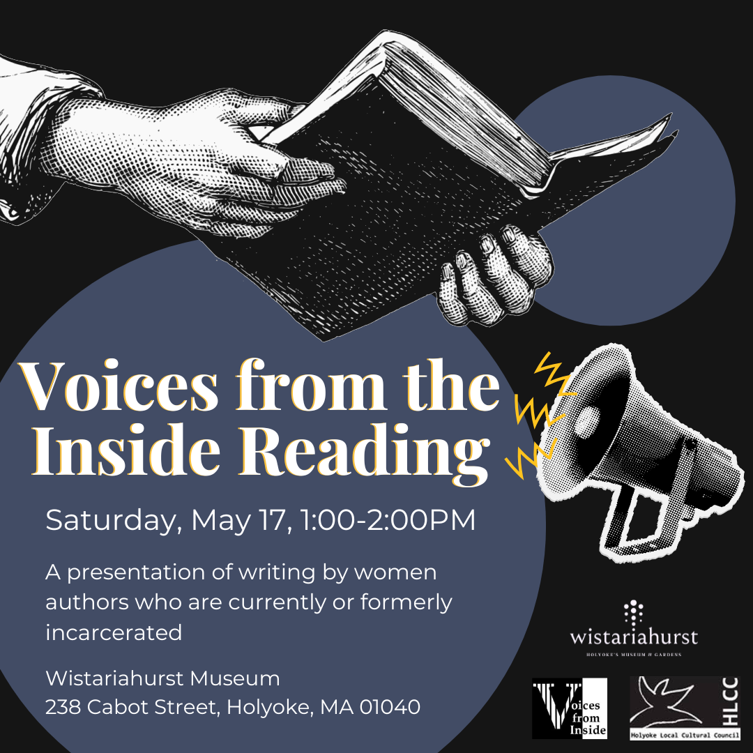 Voices from the Inside (VFI) involucra a través de la escritura a mujeres y niñas que han sido encarceladas o que corren el riesgo de serlo. La organización anima a estas escritoras a encontrar su voz y cultivar el liderazgo a través de talleres de escritura creativa. El trabajo de VFI se basa en principios fundamentales: «todo el mundo tiene una voz única y fuerte; todo el mundo nace con genio creativo; la escritura como forma de arte pertenece a todas las personas, independientemente de su clase económica o nivel educativo; la enseñanza del oficio puede hacerse sin dañar la voz original del escritor o su autoestima artística y; un escritor es alguien que escribe». VFI también anima a sus participantes a compartir su trabajo en presentaciones, conversaciones y actuaciones como parte de su iniciativa Voices Carry. El Museo Wistariahurst se complace en acoger una de estas presentaciones. La lectura de Voices from the Inside en Wistariahurst tendrá lugar el sábado 17 de mayo, de 1:00 a 2:00.