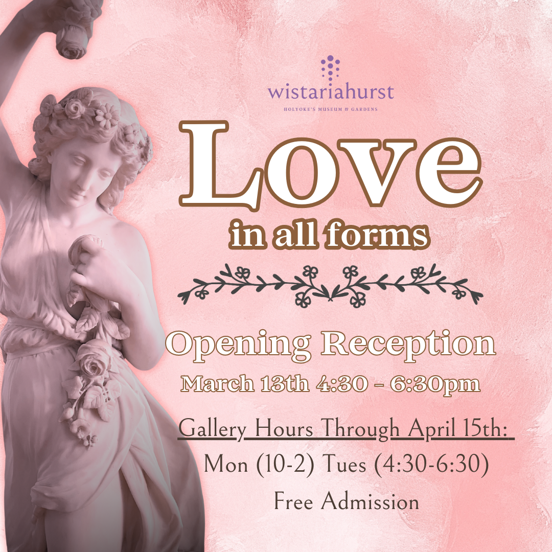 The opening reception of “Love, in all forms” will be held Thursday, March 13, from 4:30 - 6:30 pm. Wistariahurst is an artist-friendly space that encourages creativity and supports the growth of this region’s artists. This event is free and open to the public. We hope that you stop by and explore “Love, in all forms!”\